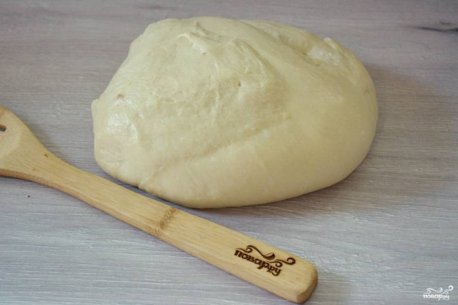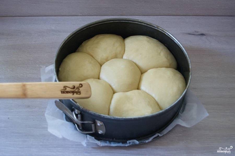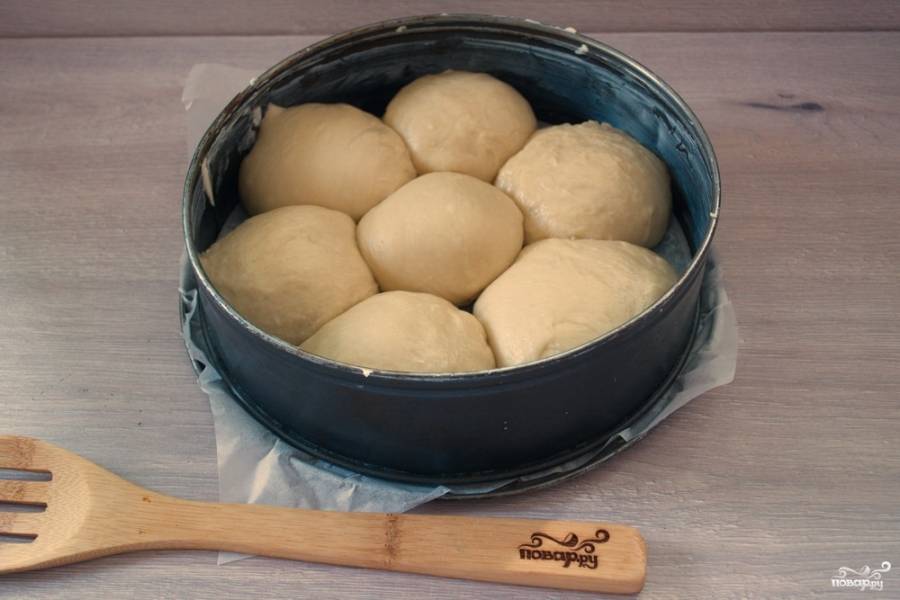 Припудрите стол мукой. Выложите на него тесто. Разделите его на несколько равных кусочков. Круглую разьемную форму смажьте маслом. Дно её застелите пергаментом. Выложите шарики теста в форму. Затяните пищевой пленкой, дайте шарикам теста хорошо подняться. На это уйдет около 3 часов.