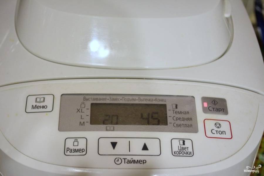 Установите ведерко в хлебопечку на замес теста. Время замеса — 45 минут. У меня это режим для теста пиццы. Спустя указанное время выключите хлебопечку. Ведро с тестом оставьте в хлебопечке на 2 часа. Если тесто за это время не успеет полностью подняться, дайте ему еще время. Тесто нужно обмять.