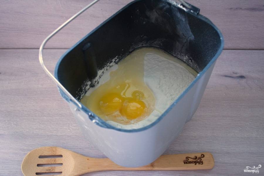 В чашу хлебопечки заложите сахар, соль, дрожжи, муку, молоко, яйца, сметану, ванильный сахар, соль и сливочное масло.