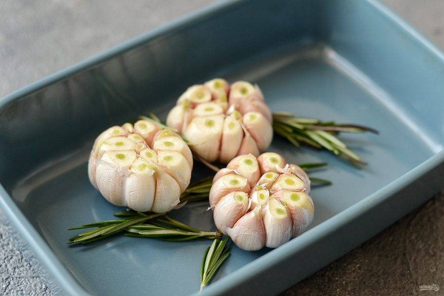 Переложите в форму для запекания. Сбрызнете оливковым маслом. Добавьте веточку розмарина. Накройте фольгой и запекайте в заранее разогретой до 150 градусов духовке 1-1,5 часа.