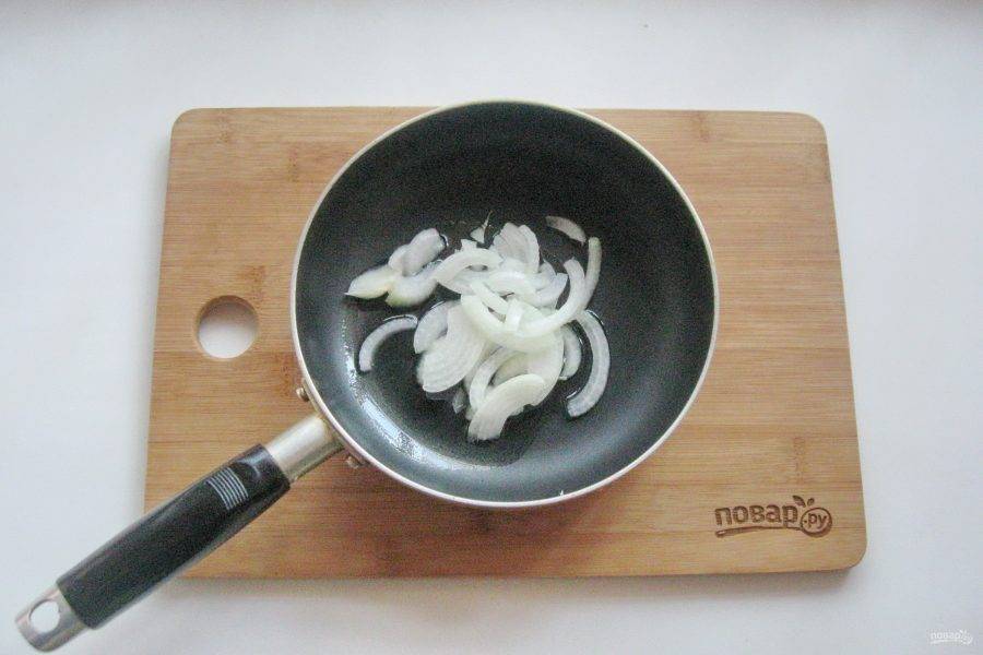 Но пока фасоль варится, репчатый лук очистите и нарежьте. Выложите в сковороду с подсолнечным маслом.