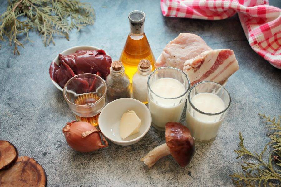 Сковороду смажьте растительным маслом. Шпик, мясо кабана порежьте мелким кубиком и выложите в сковороду. Печень проверьте на повреждения желчью, если есть удалите, порежьте на кусочки и выложите в сковороду. Грибы порежьте кубиком и добавьте к мясу и печени.
