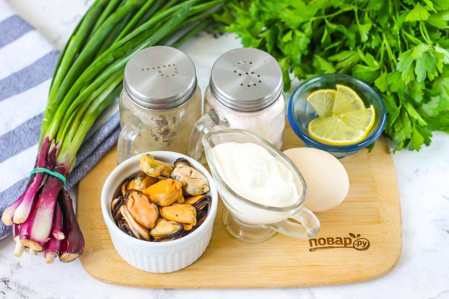 Подготовьте указанные ингредиенты. Мидии заранее отварите в течение 5-6 минут, если они были сырые. Если вы приобрели варено-мороженые морепродукты, то просто залейте их кипятком и оставьте на 3-5 минут для прогревания.