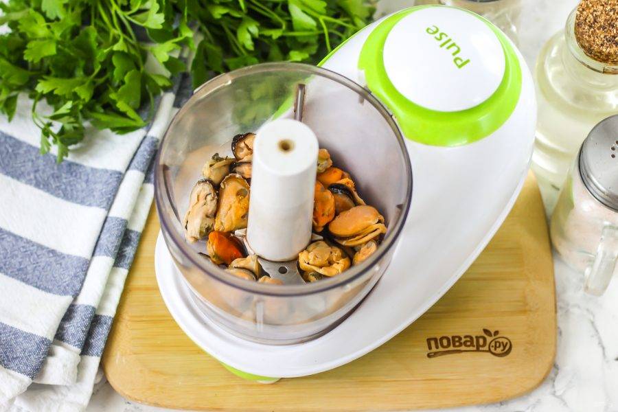 Мидии выложите в чашу измельчителя или блендера, в глубокую емкость, если собираетесь пюрировать все погружным блендером.