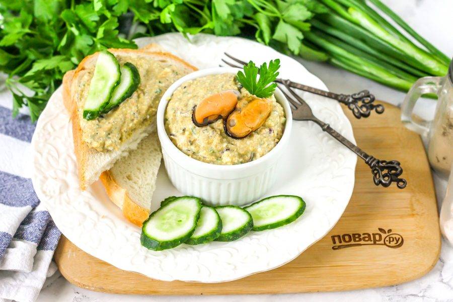 Выложите паштет из мидий в пиалу или креманку, подайте к столу с хлебом, сухариками, гренками или тостами.
