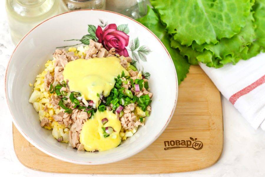 Печень минтая также измельчите и добавьте в емкость, не удаляя масло, в котором она была. Промойте стебли зеленого лука и измельчите. Добавьте к остальным ингредиентам.