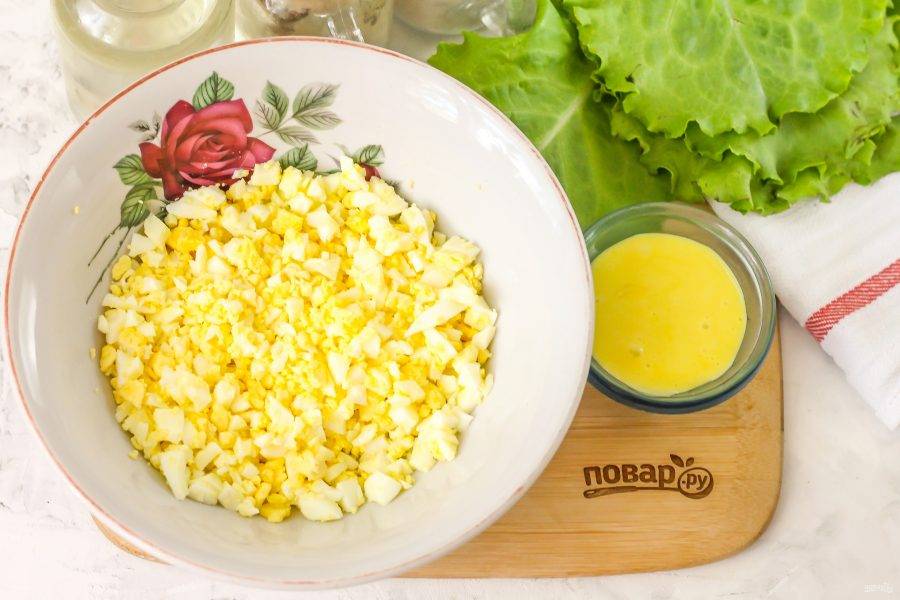 Очистите отварные куриные яйца от скорлупы, промойте в воде, чтобы даже кусочка скорлупы не осталось. Мелко нарежьте и выложите в глубокую емкость. По желанию куриные яйца можно натереть на терке с мелкими ячейками.