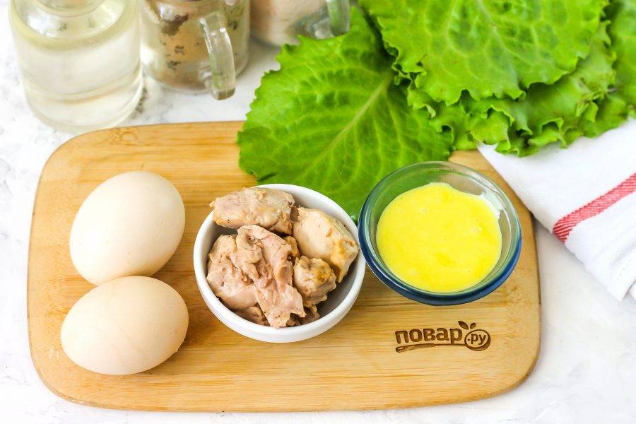 Подготовьте указанные ингредиенты. Куриные яйца отварите заранее в течение 12 минут с момента закипания воды, а затем охладите в холодной воде.
