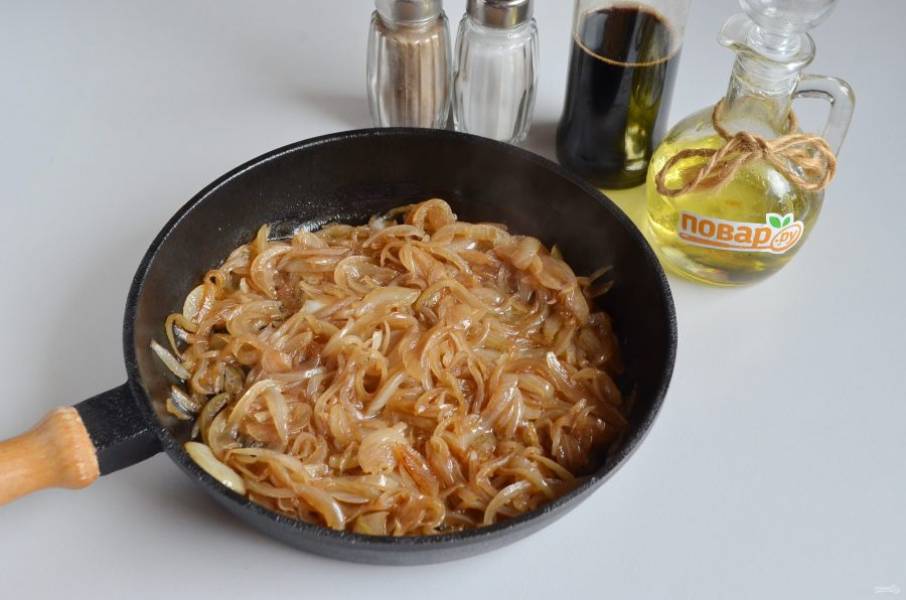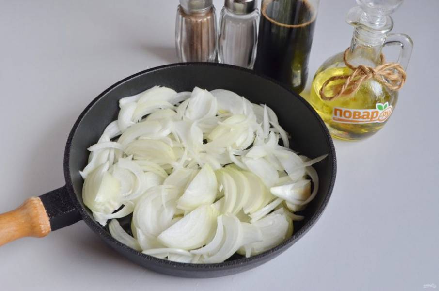 2. Очистите лук, сполосните под холодной водой. Порежьте тонко полукольцами, обжарьте на растительном масле до мягкости, солить не нужно.