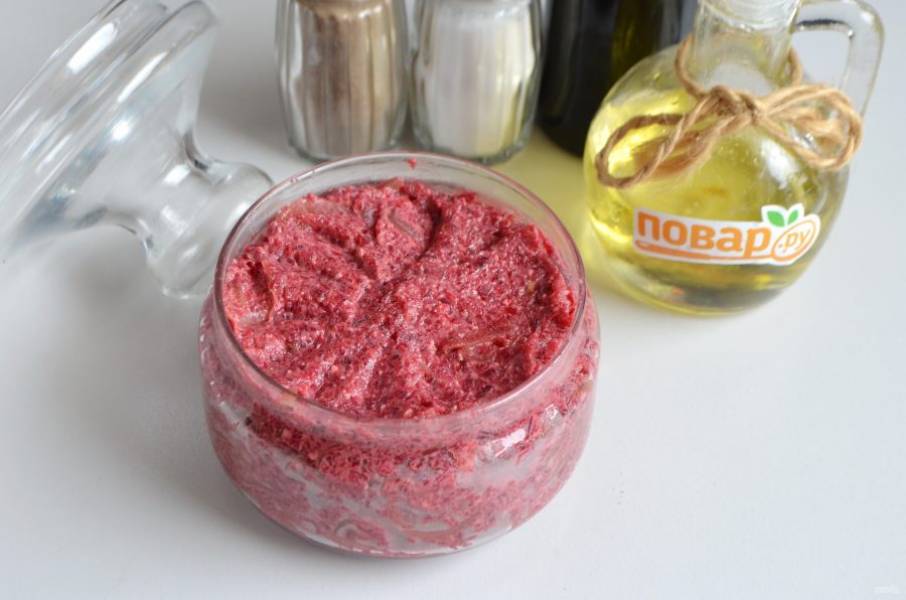 5. Соедините свекольную массу с луком, перемешайте, откорректируйте на соль-перец.