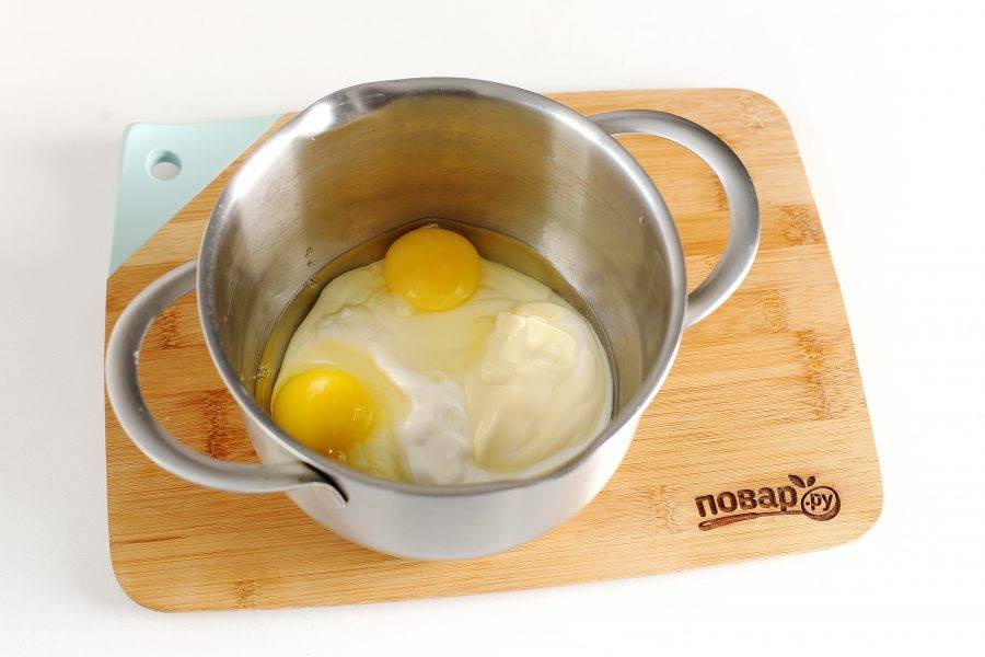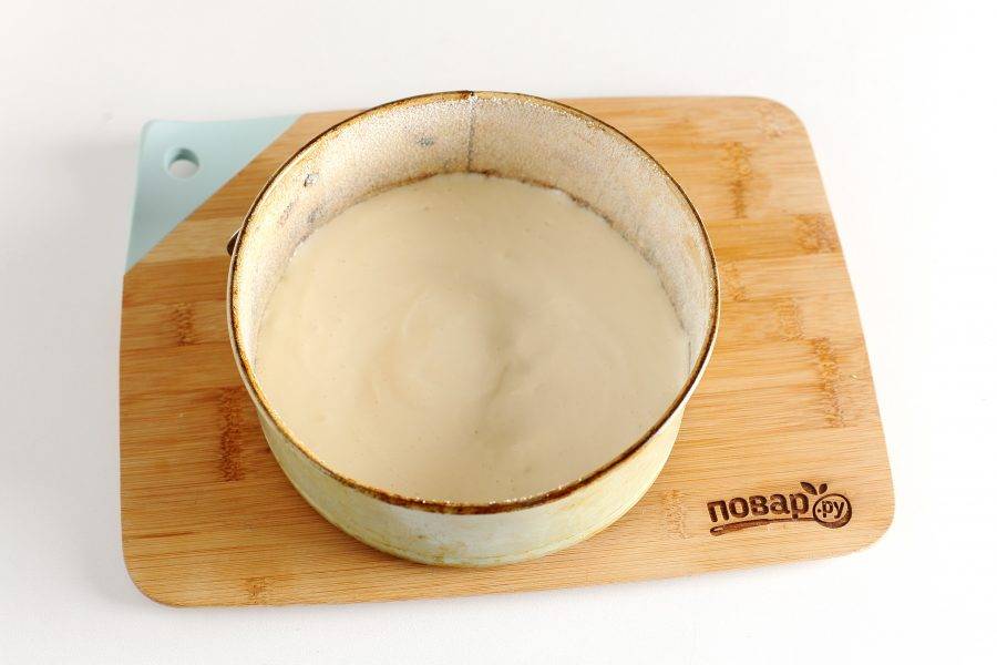 Форму для запекания смажьте растительным маслом. Дно и бока можно посыпать мукой или манкой. Вылейте примерно половину порции теста.