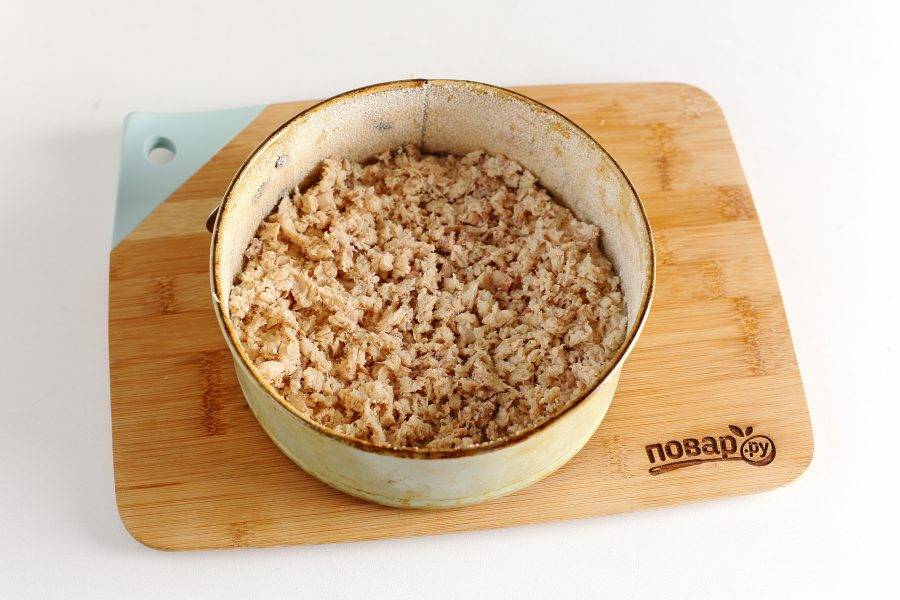 Рыбу разомните вилкой, удалив крупные косточки. Распределите поверх теста.