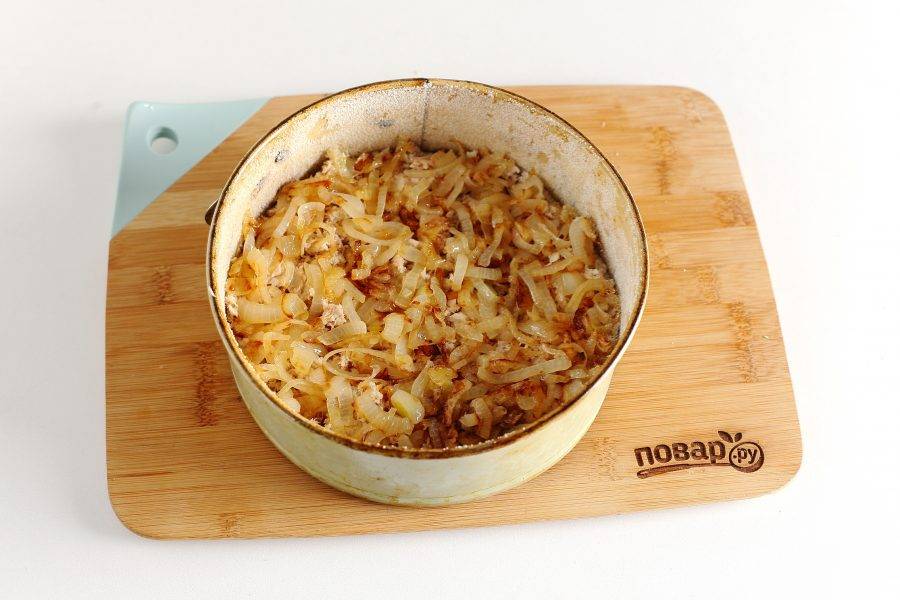 Лук обжарьте на сковороде, посолите и распределите следующим слоем.