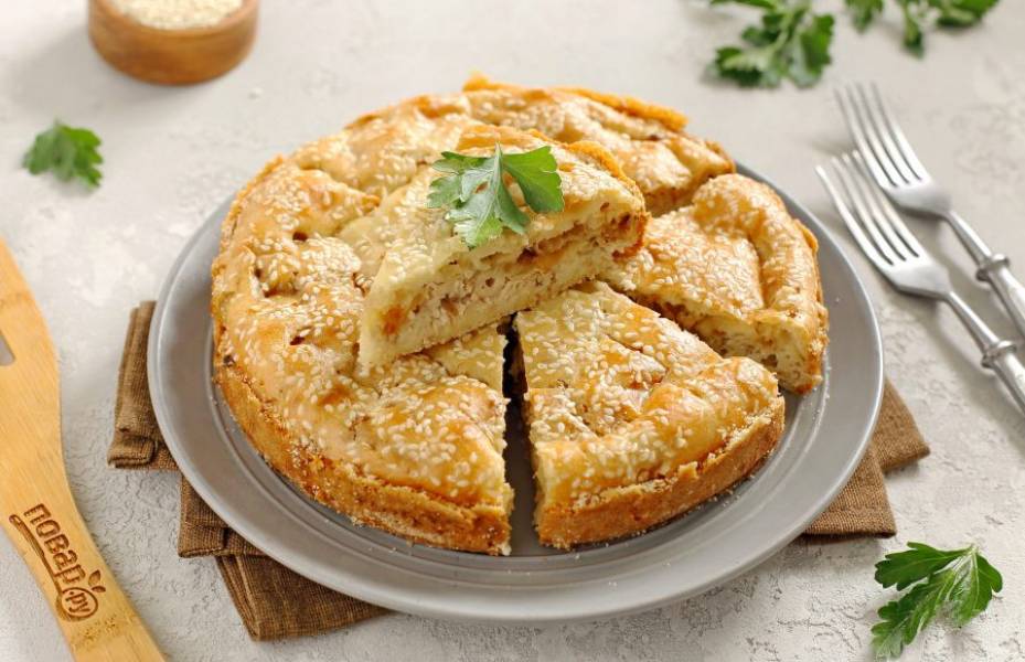 Залейте все оставшимся тестом и посыпьте сверху кунжутом. Выпекайте в духовке, разогретой до 180 градусов, 40–45 минут.