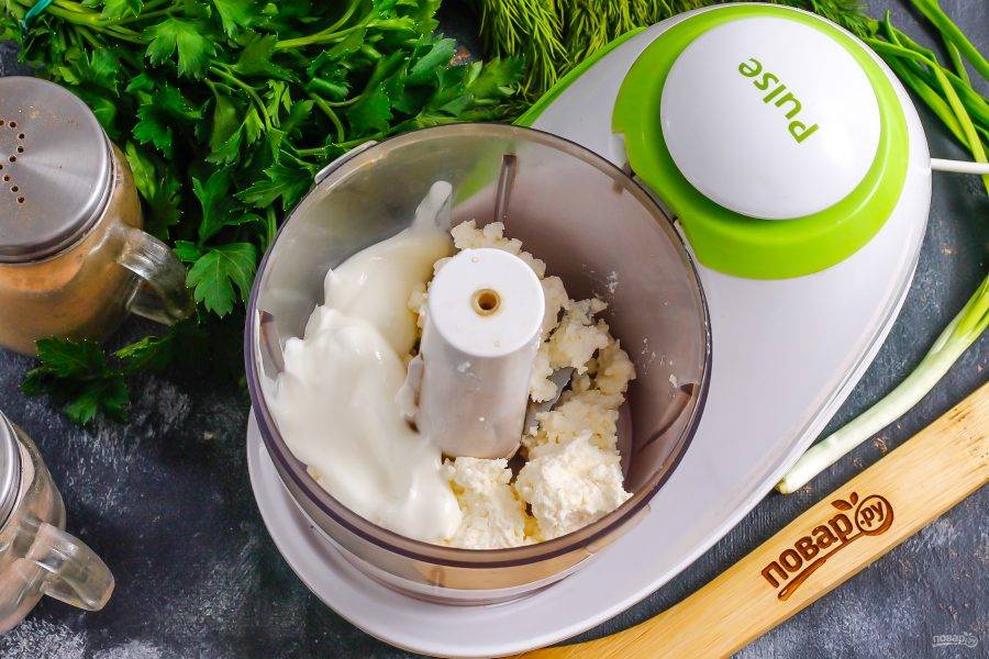 Сметану и творог любой жирности выложите в чашу измельчителя или в глубокую емкость, если будете готовить пасту с помощью погружного блендера.