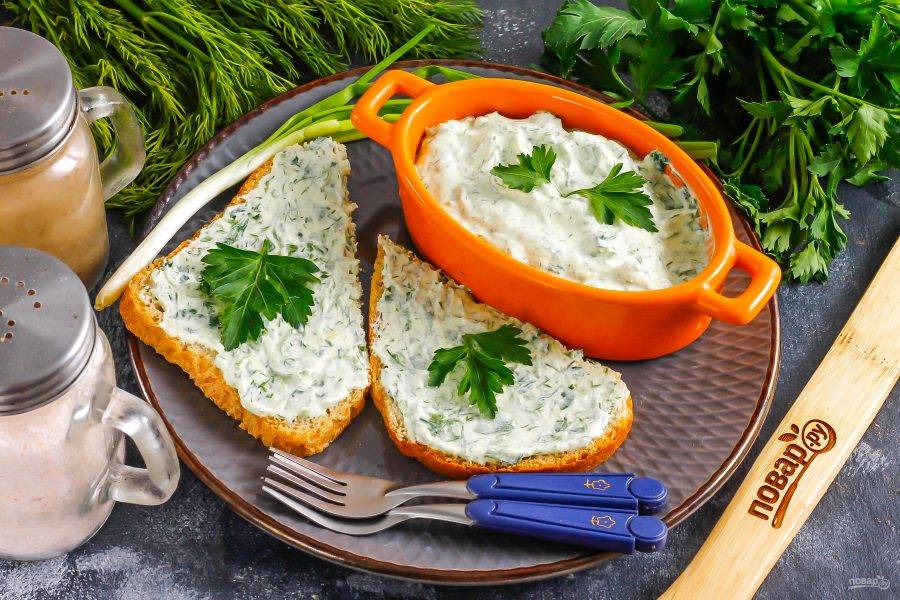 Самый быстрый вариант приготовления закуски из подручных продуктов — паста из зелени. Для ее основы можно использовать любую пряную зелень и сметану, творог любой жирности, добавляя специи по вкусу.