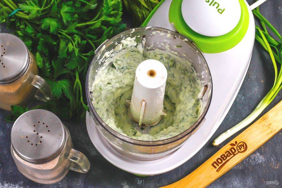 Пробейте все в течение 2-3 минут, превращая все составляющие в ароматную красочную пасту. Если она получится слишком густой, то добавьте еще сметаны.