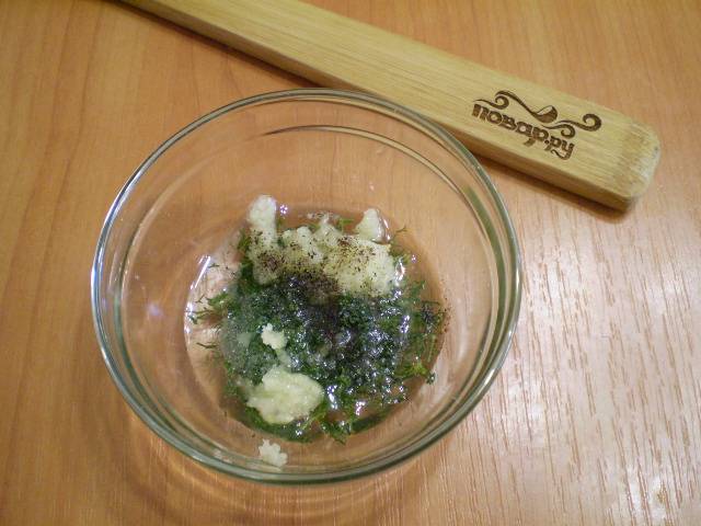 Приготовьте заправку для пасты. Смешайте соль, перец черный, чеснок, укроп и масло.