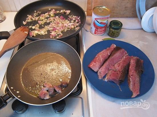 На небольшом количестве оливкового масла обжарим до легкого золотистого цвета мелко нарезанный лук. А на второй сковороде обжарим ломтики рыбы. Можно выложить филе целиком, а потом раскрошить, а можно сразу нарезать на небольшие кусочки.