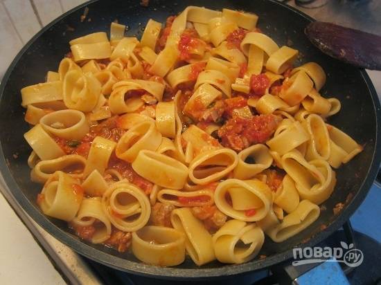 Отварим пасту в подсоленной воде согласно инструкции на упаковке (лучше слегка не доварить, пусть паста будет аль-денте) и добавляем пасту на сковороду к соусу. Даем покипеть минутку и можно подавать к столу.