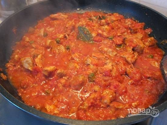 Смешаем в одной сковороде обжаренные лук и рыбу, добавим измельченные помидоры в собственном соку, каперсы, соль, перец, лавровый лист и базилик. Накроем крышкой, доводим до кипения и тушим на небольшом огне минут 20-25. Если вам нужен густой соус - готовьте без крышки.