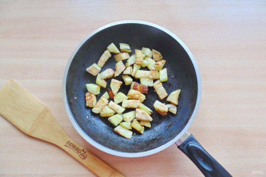 На другую сковороду выложите очищенные и нарезанные небольшим кубиком баклажаны. Добавьте подсолнечное масло.