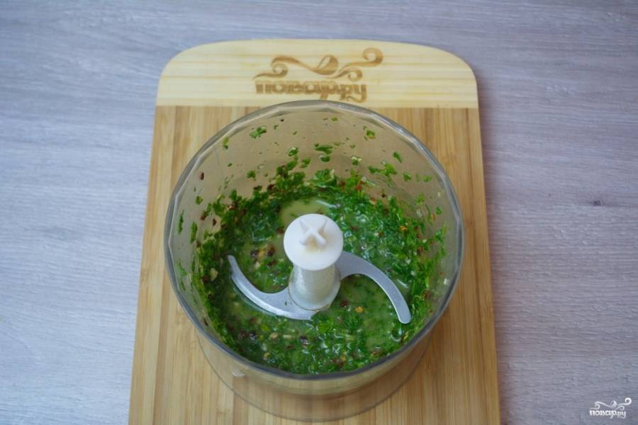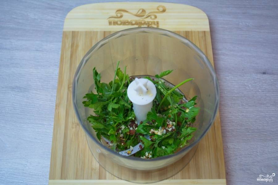 В чашу блендера кладите листики петрушки, смесь специй, немного растительного масла.