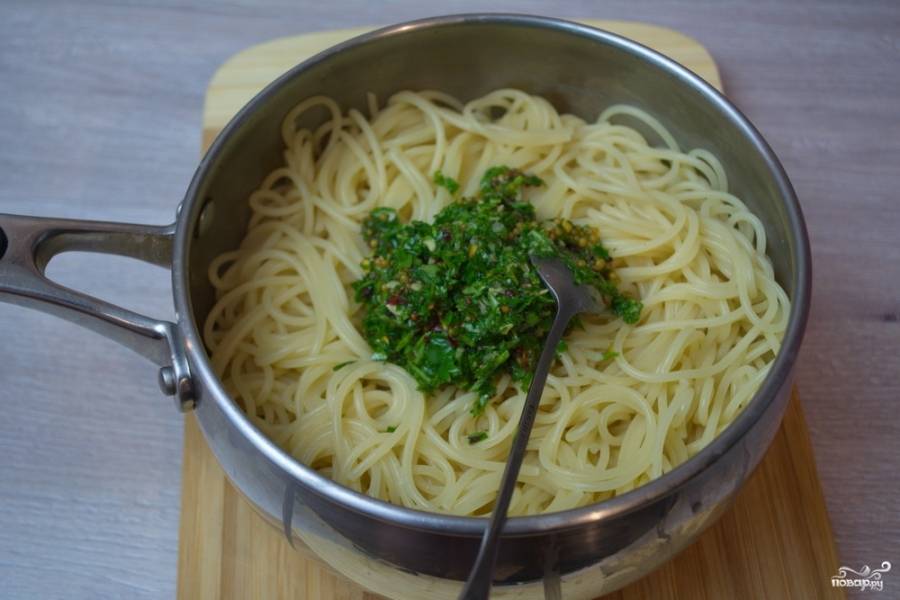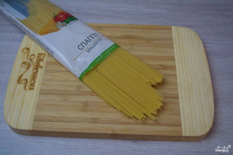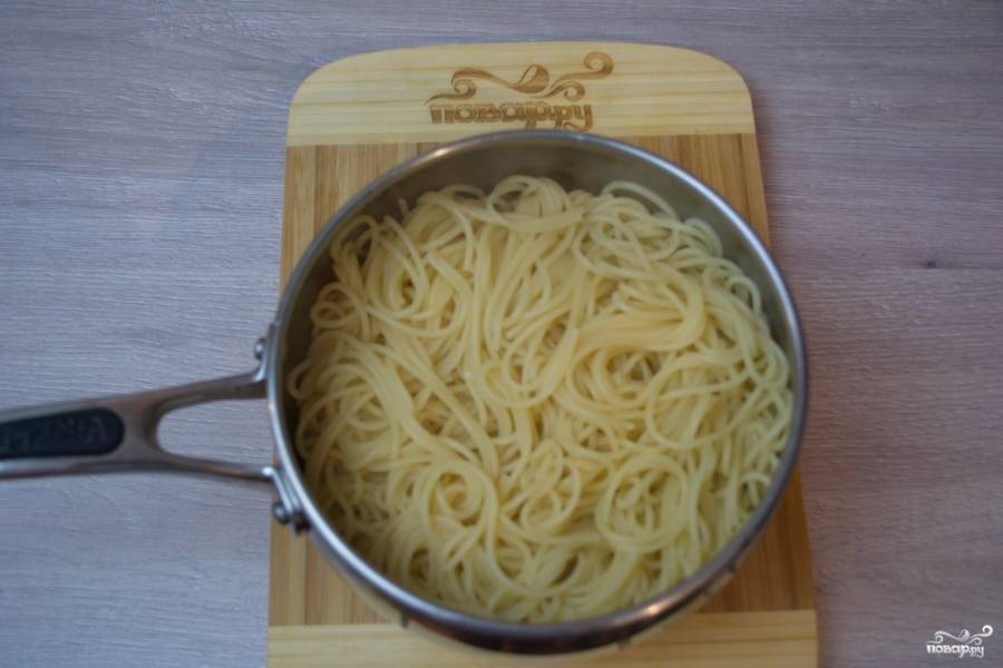 Спагетти отварите до готовности в подсоленной кипящей воде. Слейте с них воду, но часть ее оставьте.