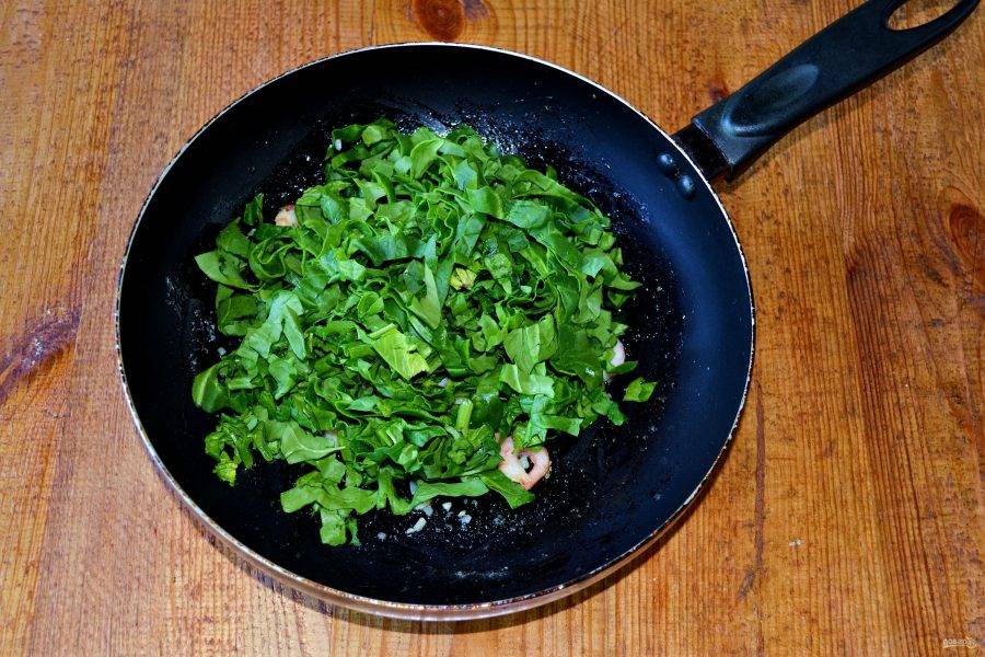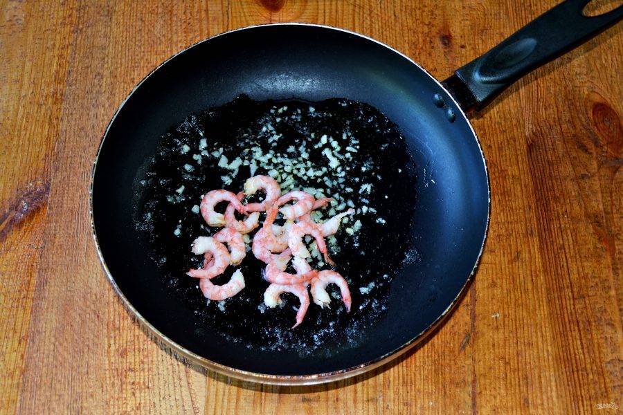 Очищенные креветки выложите на сковороду и обжарьте пару минут, помешивая.