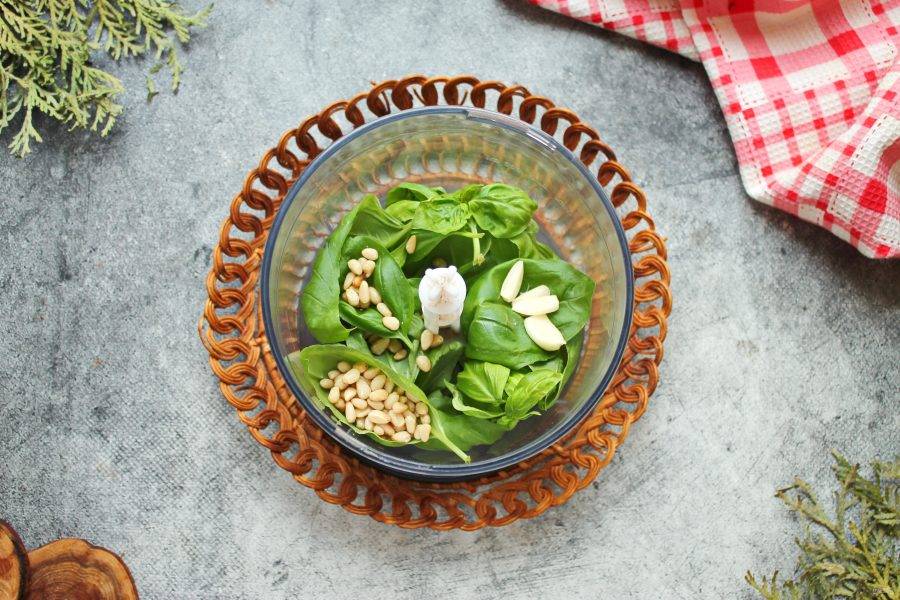 В чашу блендера выложите листья базилика, кедровые орешки и очищенный чеснок.
