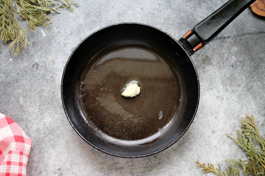 Чеснок очистите и немного раздавите широкой стороной лезвия ножа. В сковороду налейте растительное масло и разогрейте на среднем огне. Добавьте в масло чеснок и обжаривайте в течение 30 секунд, чтобы масло стало ароматным.