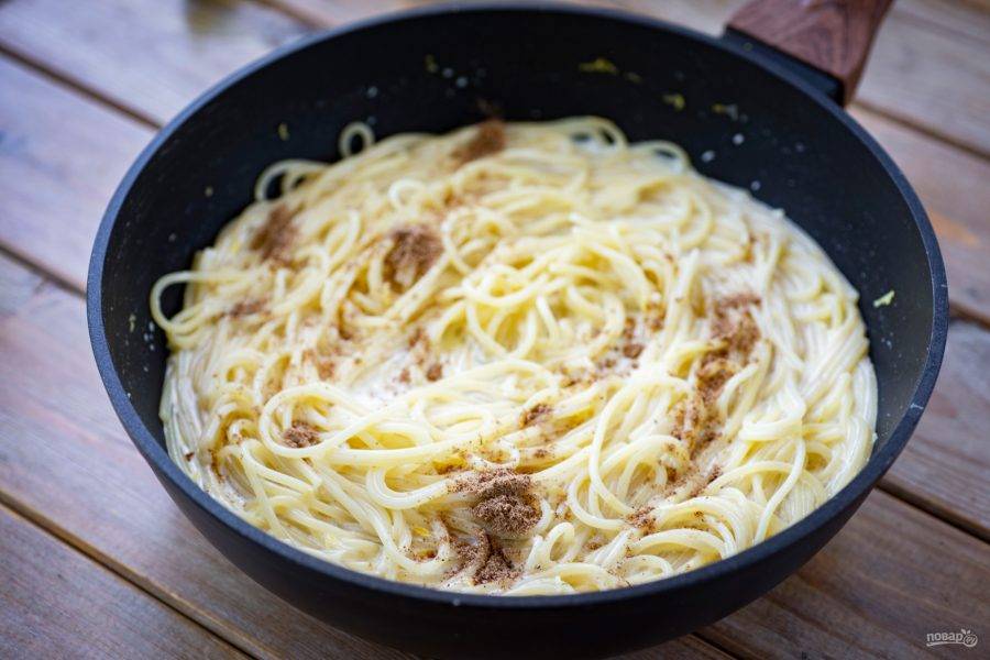 Добавьте в сковороду сливки и 200 мл. воды, в которой варились спагетти.