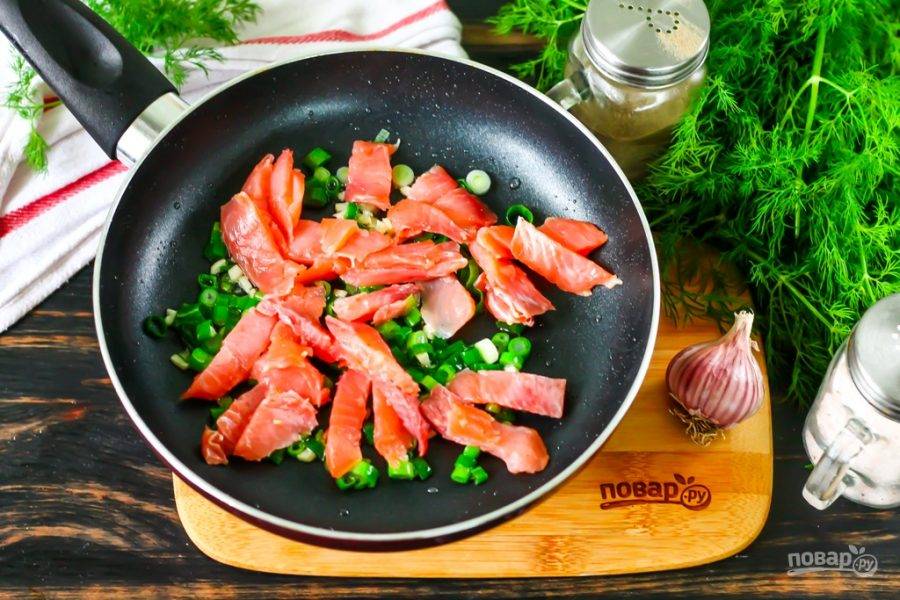 В это время нарежьте кусочками филе лосося, добавьте его на сковороду. Обжарьте около 2 минут, время от времени перемешивая.