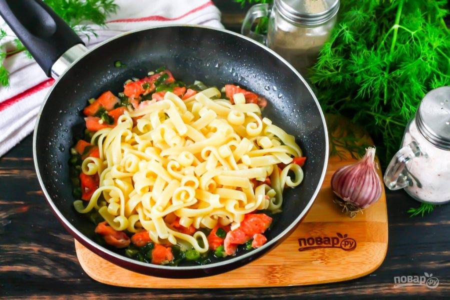 К этому времени паста уже будет готова - переместите ее шумовкой из бульона на сковороду, отряхивая от лишней жидкости. Перемешайте содержимое сковороды и протомите около 1-2 минут, чтобы паста пропиталась ароматами соуса.