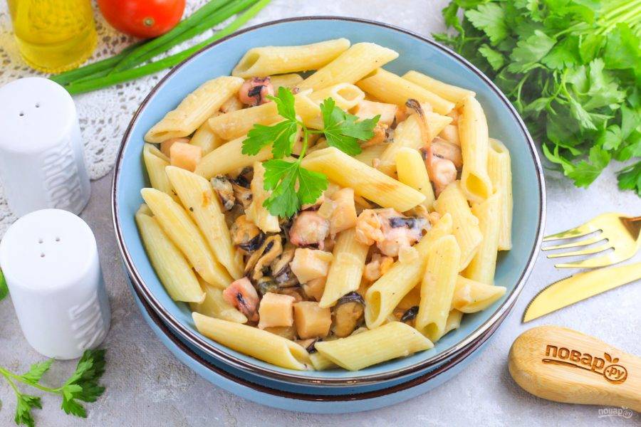 Выложите сочную и аппетитную пасту с морепродуктами в тарелки и подайте к столу горячей.