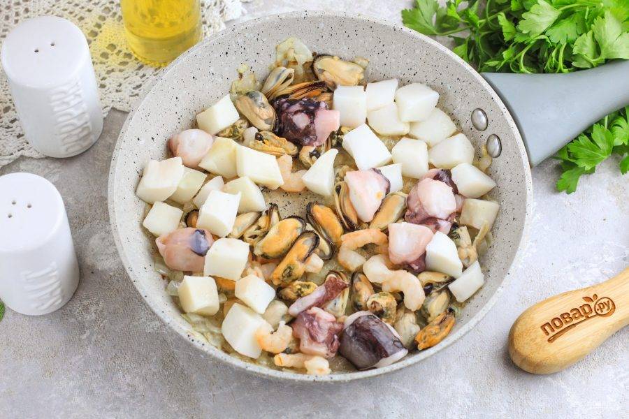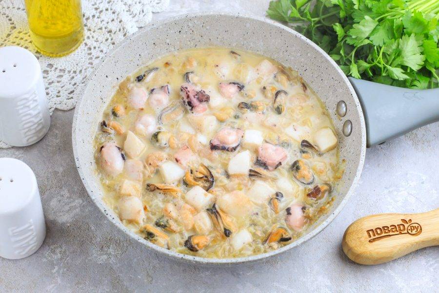 Выложите в сковороду морской коктейль. Если вы его приобретали замороженным, то вам сначала его нужно разморозить при комнатной температуре, а потом начинать готовить! Поджарьте все в течение 2-3 минут.