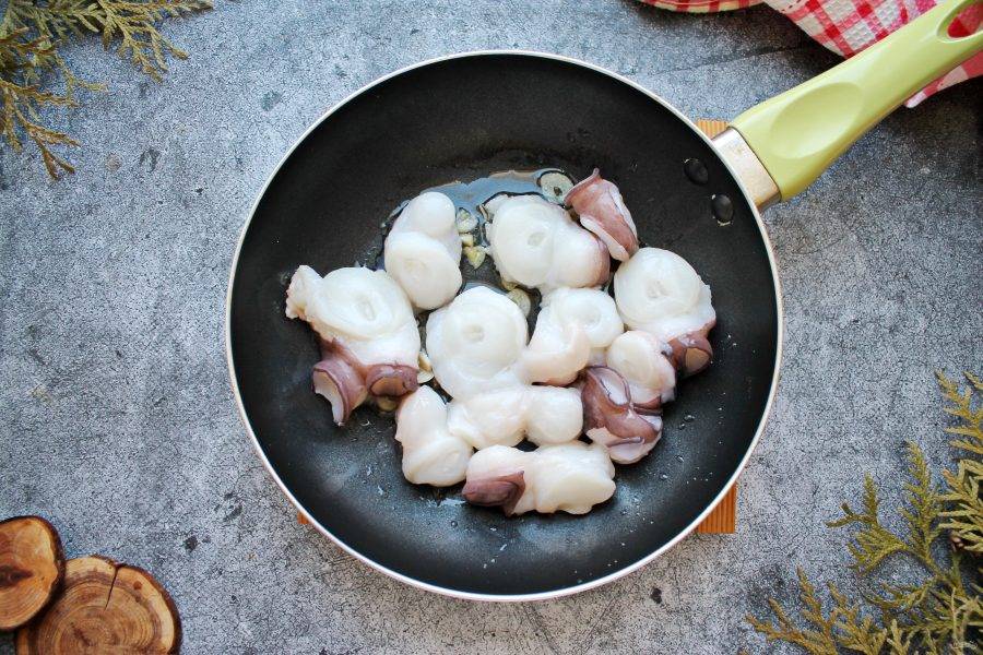 Осьминога сполосните, порежьте на кусочки и добавьте в сковороду. Обжаривайте все в течение 3 минут.
