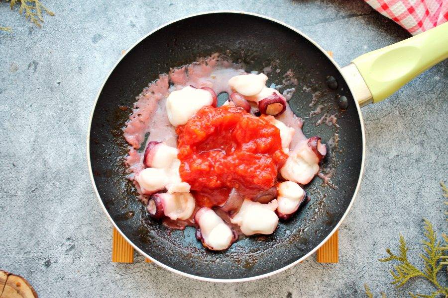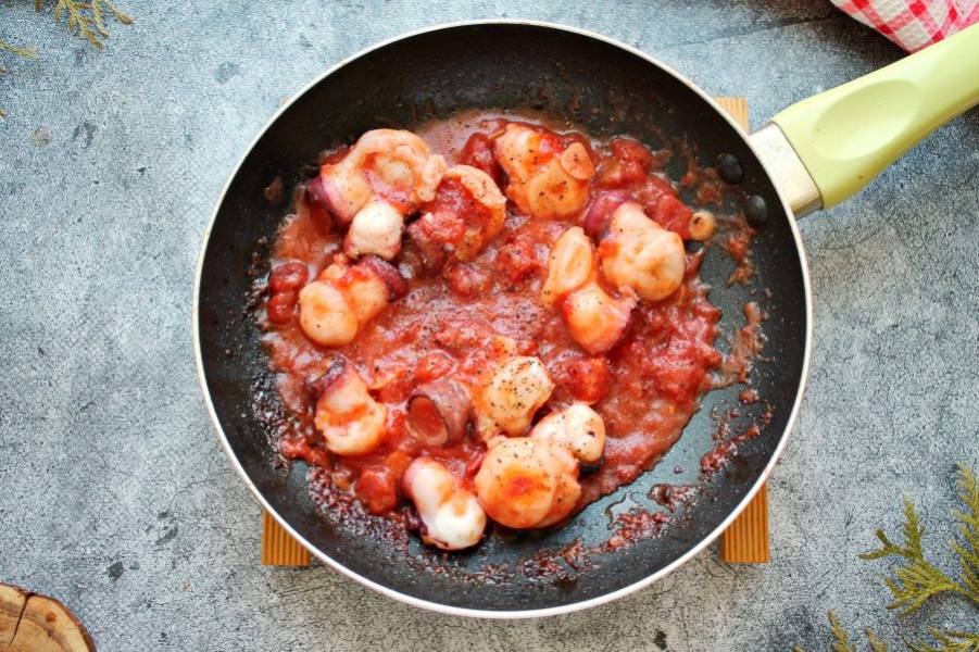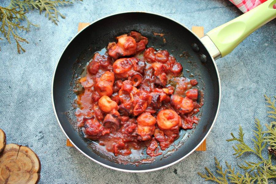 После приготовления осьминога снимите крышку и готовьте до желаемой густоты соуса.