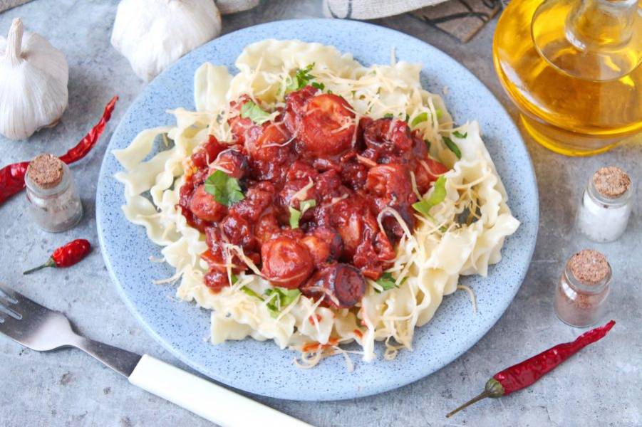 В кастрюлю налейте воду, посолите и доведите до кипения. Опустите пасту и варите, как указано в инструкции. Откиньте на сито, дайте стечь воде и переложите по тарелкам. После этого добавьте осьминога в томатном соусе, посыпьте тертым сыром и подавайте к столу.