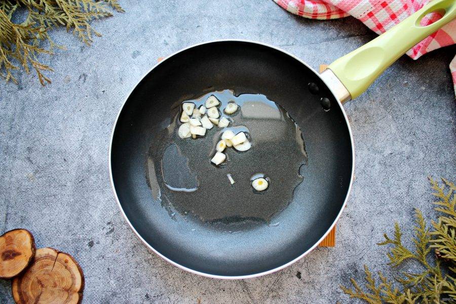 В сковороду налейте растительное масло и разогрейте на среднем огне. Добавьте в масло порезанный чеснок и обжаривайте в течение 30 секунд.