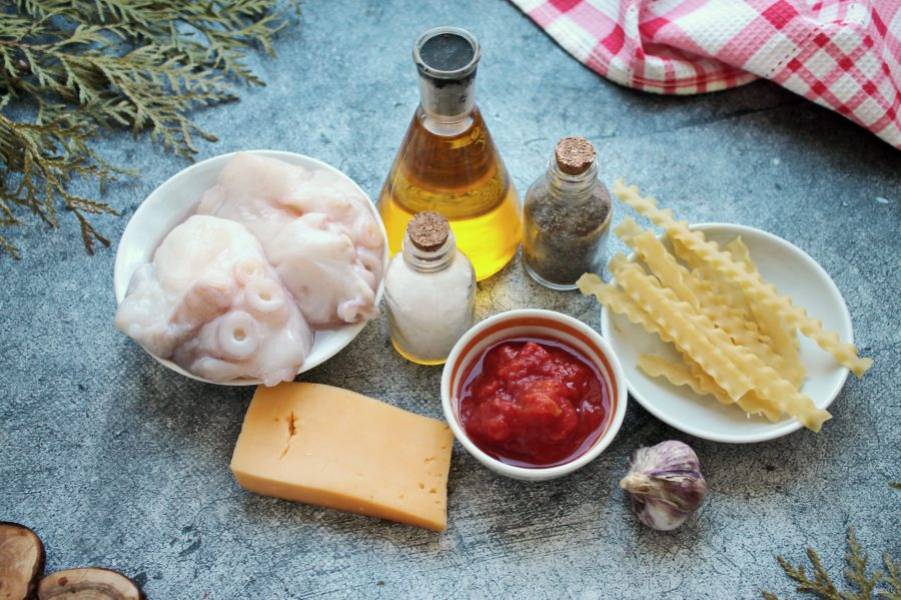 Подготовьте все необходимые ингредиенты для приготовления пасты с осьминогом в томатном соусе.