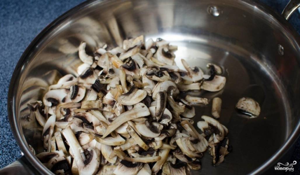 Обжарьте репчатый лук, грибы и болгарский перец. Посолите по вкусу.
