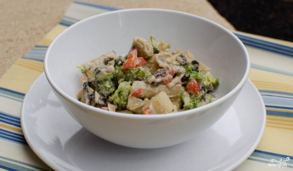 Слейте воду, в готовые макароны добавьте нежирные сливки и нашу зажарку из репчатого лука, грибов и болгарского перца.