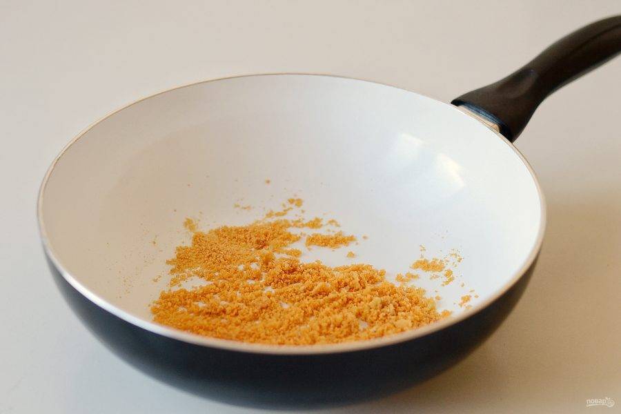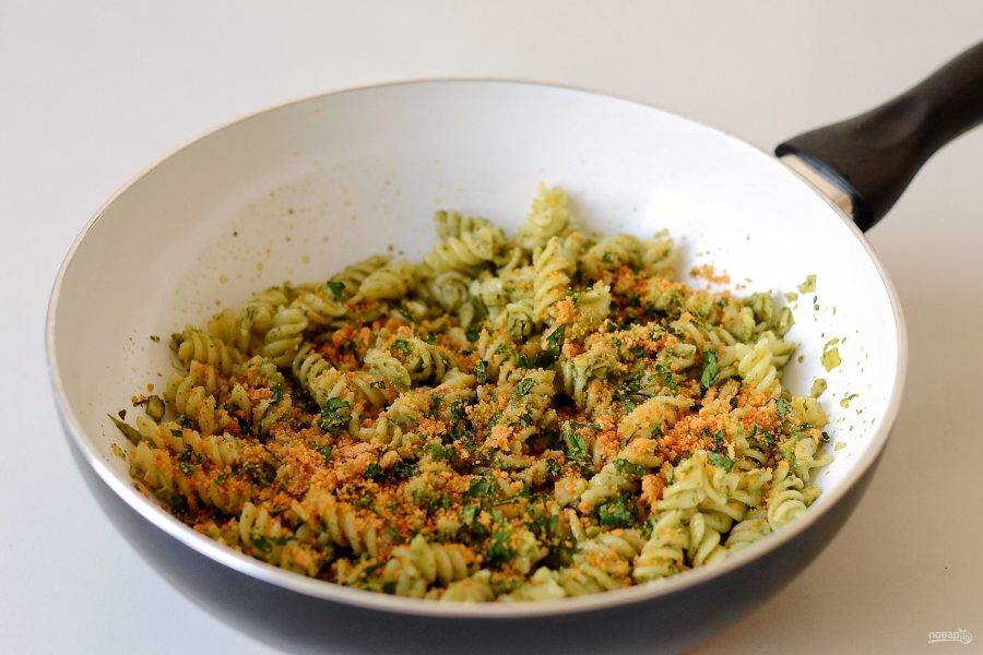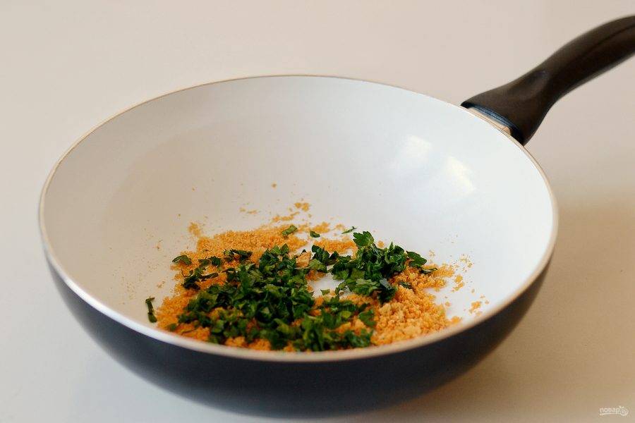 Чеснок измельчите, затем обжарьте в масле примерно 30 секунд. Добавьте сухари, готовьте еще 3-4 минуты.
