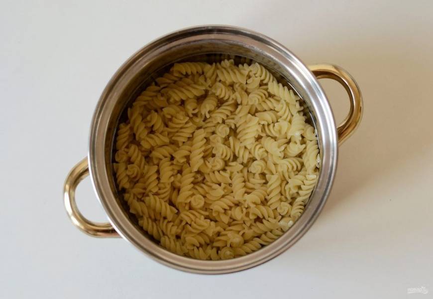 Макароны отварите в кипящей подсоленной воде до состояния "Аль денте". Слейте воду.