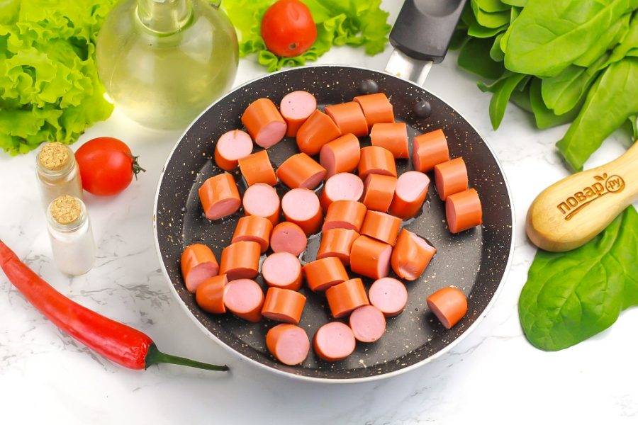 Нарезанные сосиски обжарьте на сковороде с растительным маслом примерно 2-5 минут до легкой румяности, время от времени их переворачивая.