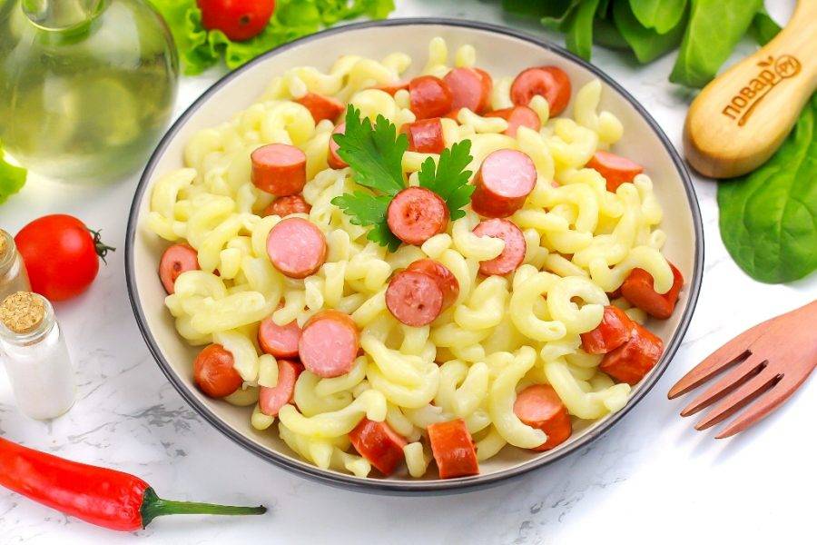Приготовить вкусную пасту с сосисками — проще простого! По желанию добавляйте любые специи, пряности, соусы.