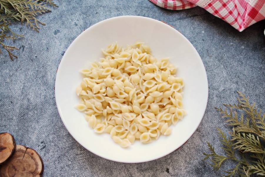 В кастрюлю влейте воду, посолите и доведите до кипения на среднем огне. Всыпьте пасту и варите до состояния, когда она почти готова. Откиньте на сито и дайте воде стечь.