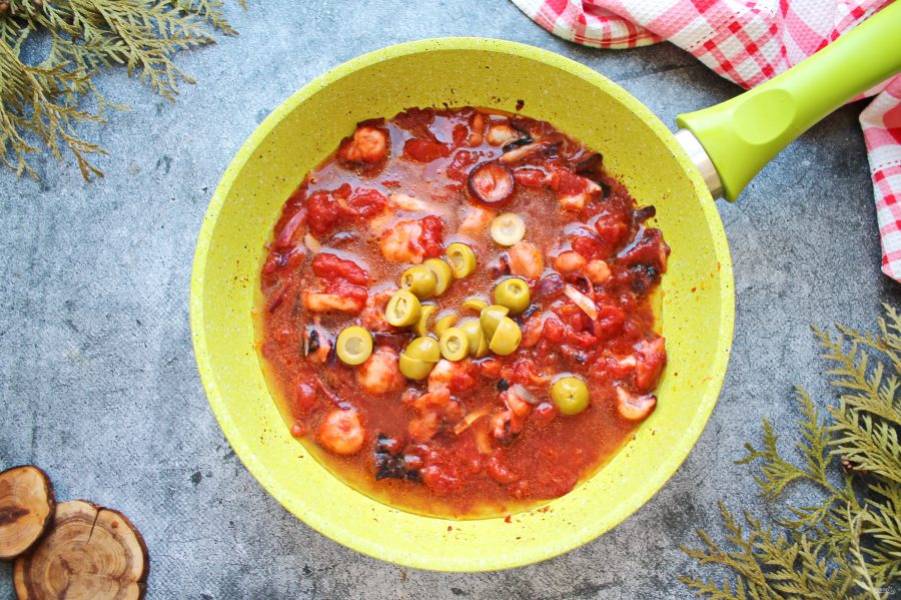 Влейте в сковороду оставшуюся воду, добавьте разрезанные оливки, поперчите и посолите.