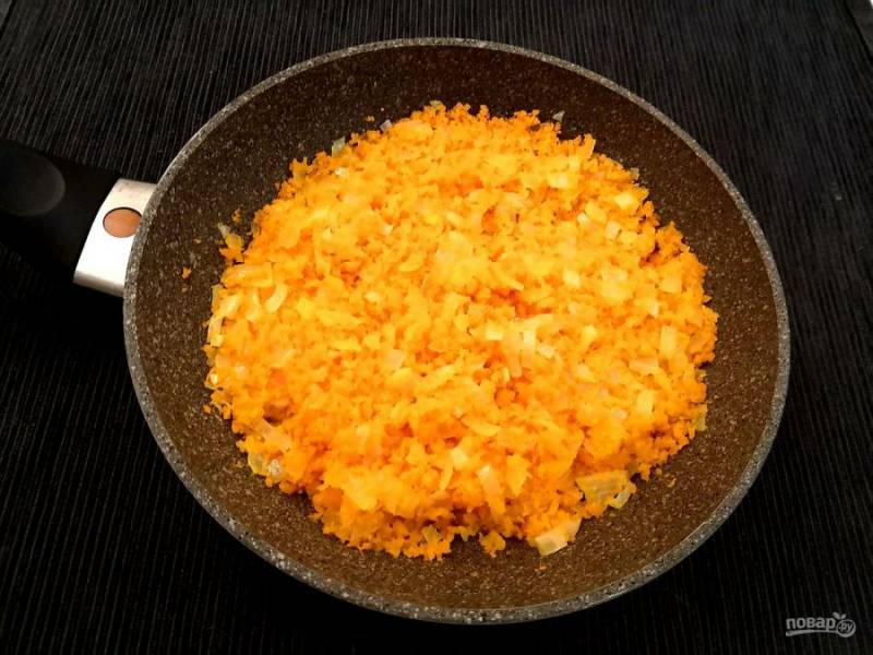 Лук порезать мелко, обжарить на сливочном масле, потом добавить морковь и обжарить все вместе.